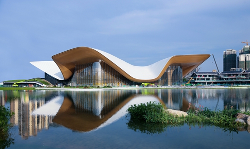 在位于成都市中的金牛區(qū),波光粼粼的平湖之畔佇立著一座既有金屬光澤,又有現(xiàn)代藝術美感的芙蓉花建筑,與旁邊川西山脈般連綿起伏的場館相映成趣。花型、綠意、山勢、水波在日光下交織,于水天交接之處呈現(xiàn)出別樣的城市公園韻味。這,就是中國五冶集團承建的天府藝術公園·文博坊片區(qū)建設項目。