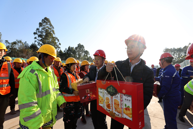 朱永繁董事長一行先后來到兩項目現(xiàn)場,詳細了解項目概況、工期進度、策劃編制及執(zhí)行、履約管理、春節(jié)加班安排等方面情況,并向他們送去豬肉、糕點、水果等節(jié)日慰問品。在隨后召開的座談會上,朱永繁董事長代表集團公司向新春佳節(jié)期間堅守崗位的廣大員工、合作伙伴及各位工友表示敬意和感謝,祝大家新年快樂,幸福安康。他指出,2024年是公司“十四五”規(guī)劃極為關(guān)鍵的一年,五冶集團面臨的形勢更加嚴峻,挑戰(zhàn)更高,壓力更大,全體五冶人特別是各級領(lǐng)導(dǎo)務(wù)必拿出拼的精神、干的狀態(tài),做到“放假不放松,休息不休戰(zhàn)”,一如既往抓好安全生產(chǎn)、現(xiàn)場管理、市場拓展等工作,堅決扛起責(zé)任擔(dān)當,拼搏沖刺奮斗,推動集團公司實現(xiàn)里程碑式的新跨越。