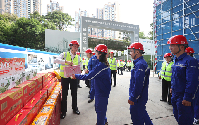 朱永繁董事長一行來到成都市城市建設(shè)和自然資源檔案館、白鷺灣科技生態(tài)園三期項(xiàng)目現(xiàn)場(chǎng),仔細(xì)檢查安全環(huán)保工作落實(shí)和執(zhí)行是否到位,詳細(xì)了解項(xiàng)目策劃、工期、技術(shù)、質(zhì)量、經(jīng)營等管理情況,并向一線員工送上礦泉水、牛奶、飲料、水果、方便面、面包糕點(diǎn)等慰問品,并代表集團(tuán)公司黨委、董事會(huì)、經(jīng)營層向堅(jiān)守崗位的廣大員工、合作伙伴及工友致以節(jié)日問候。