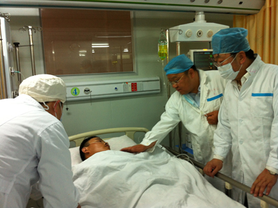 中國中冶副總裁王永光(右一),中國五冶集團(tuán)董事長程并強(qiáng)(右二)前往醫(yī)院看望受傷員工。
