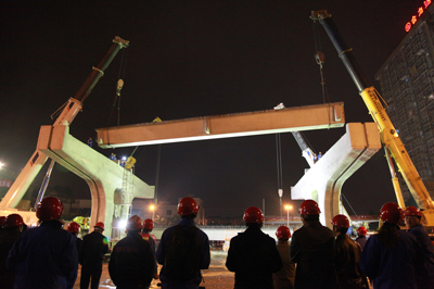 11月22日晚23點(diǎn)28分,在四臺(tái)大型吊車的同時(shí)作業(yè)下,??作為“兩環(huán)兩射兩快”工程中的“兩射”之一,成溫射線首跨箱梁至11月23日凌晨完成首跨8片箱梁的吊裝施工,標(biāo)志著成溫射線改造工程進(jìn)入上部結(jié)構(gòu)施工階段。四川省、成都市主流媒體《華西都市報(bào)》、《成都日?qǐng)?bào)》、《成都商報(bào)》、《成都晚報(bào)》、《天府早報(bào)》、成都電視臺(tái)等聚焦報(bào)道了本次吊裝。