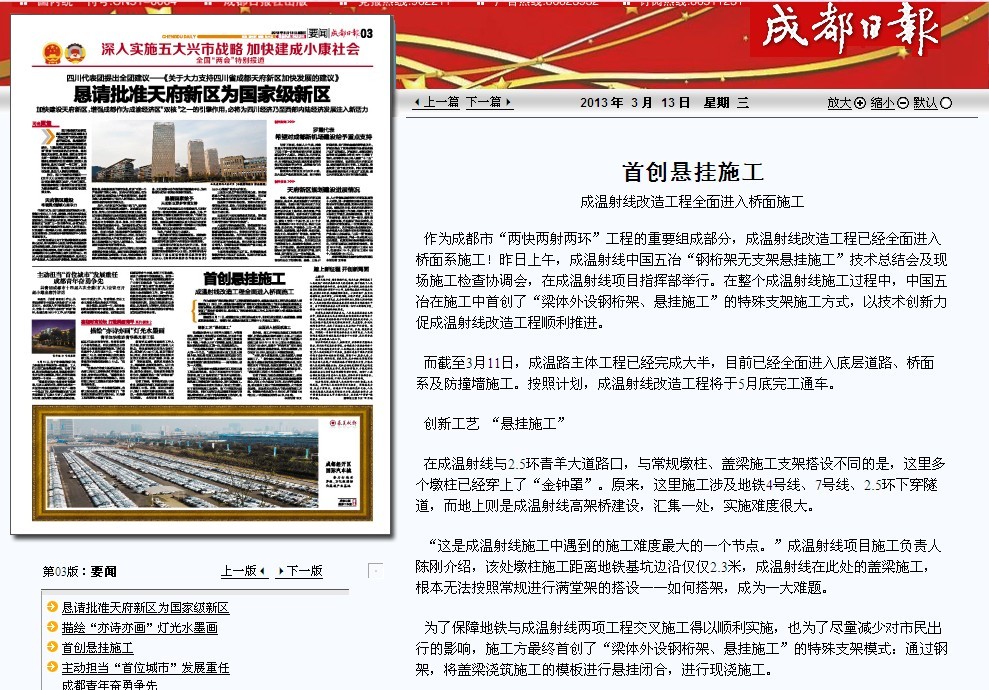 作為成都市“兩快兩射兩環(huán)”工程的重要組成部分,成溫射線改造工程已經(jīng)全面進入橋面系施工!昨日上午,成溫射線中國五冶“鋼桁架無支架懸掛施工”技術(shù)總結(jié)會及現(xiàn)場施工檢查協(xié)調(diào)會,在成溫射線項目指揮部舉行。在整個成溫射線施工過程中,中國五冶在施工中首創(chuàng)了“梁體外設鋼桁架、懸掛施工”的特殊支架施工方式,以技術(shù)創(chuàng)新力促成溫射線改造工程順利推進。