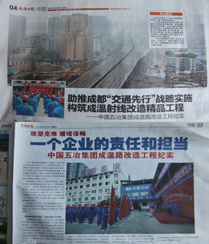 《成都日?qǐng)?bào)》以《助推成都‘交通先行’戰(zhàn)略實(shí)施?構(gòu)筑成文射線改造精品工程》為題,從抽調(diào)精兵強(qiáng)將攻堅(jiān)五大難題、創(chuàng)新工藝技術(shù)實(shí)現(xiàn)三項(xiàng)之最、團(tuán)隊(duì)攻堅(jiān)克難彰央企風(fēng)采等三個(gè)方面對(duì)成溫路改造工程進(jìn)行了全面報(bào)道,文中寫到:“提前25天,整個(gè)成溫路改造工程具備通車條件,搶回了近五個(gè)月的工期,打贏了這場(chǎng)緩堵保暢的‘戰(zhàn)役’。”?《成都晚報(bào)》則以《一個(gè)企業(yè)的責(zé)任和擔(dān)當(dāng)》為題,報(bào)道了中國(guó)五冶集團(tuán)在成溫路項(xiàng)目實(shí)施過程中首次采用“鋼桁架無支架施工”技術(shù),開創(chuàng)了同類橋梁施工的先河。同時(shí)點(diǎn)名報(bào)道了文興勇、李代光等一批優(yōu)秀項(xiàng)目骨干,盛贊由他們組成的團(tuán)隊(duì)“一次次攻堅(jiān)克難,為順利完成各個(gè)節(jié)點(diǎn)作出了貢獻(xiàn)”。(張旖)