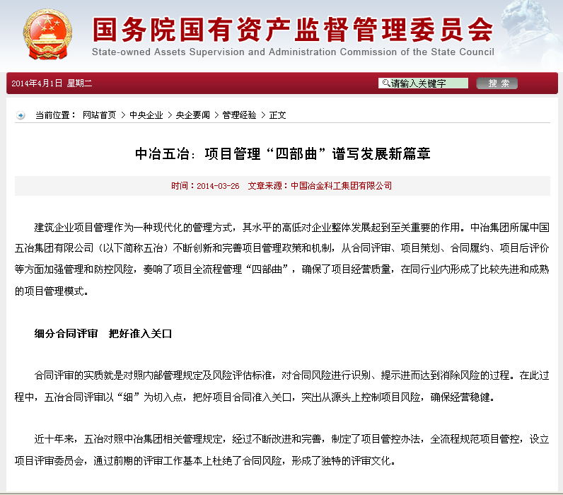 文章指出:“中國五冶集團(tuán)有限公司從合同評審、項(xiàng)目策劃、合同履約、項(xiàng)目后評價(jià)等方面加強(qiáng)管理和防控風(fēng)險(xiǎn),奏響了項(xiàng)目全流程管理‘四部曲’,確保了項(xiàng)目經(jīng)營質(zhì)量,在同行業(yè)內(nèi)形成了比較先進(jìn)和成熟的項(xiàng)目管理模式?!薄?013年,項(xiàng)目管理‘四部曲’使中國五冶集團(tuán)實(shí)現(xiàn)了快速健康發(fā)展,各項(xiàng)經(jīng)濟(jì)指標(biāo)再上新臺階:實(shí)現(xiàn)營業(yè)收入140億元,新簽合同180億元,年利潤超過6億元,在中冶集團(tuán)施工企業(yè)綜合業(yè)績考評中取得了第一名的好成績,并被國務(wù)院國資委評為2013年度‘中央企業(yè)先進(jìn)集體’?!?/span>