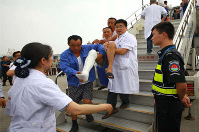 5月18日,搭載306名傷員的三架包機(jī)先后順利抵達(dá)成都雙流國(guó)際機(jī)場(chǎng)。四川省常務(wù)副省長(zhǎng)鐘勉,中冶集團(tuán)總經(jīng)理,中國(guó)中冶董事長(zhǎng)、黨委書記國(guó)文清,中國(guó)中冶副總裁王永光,中國(guó)五冶集團(tuán)董事長(zhǎng)、黨委書記程并強(qiáng),中國(guó)五冶集團(tuán)黨委副書記劉偉,中國(guó)五冶集團(tuán)副總經(jīng)理田舜等領(lǐng)導(dǎo)到機(jī)場(chǎng)迎接。第一時(shí)間將159名傷員分別送往四川大學(xué)華西醫(yī)院、四川省醫(yī)院、成都市一醫(yī)院、成都市二醫(yī)院、成都市三醫(yī)院和五冶醫(yī)院,確保了傷員的及時(shí)救治。其中,公司2名受傷員工在五冶醫(yī)院接受治療。