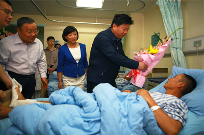 國(guó)文清、程并強(qiáng)在四川大學(xué)華西醫(yī)院看望受傷員工