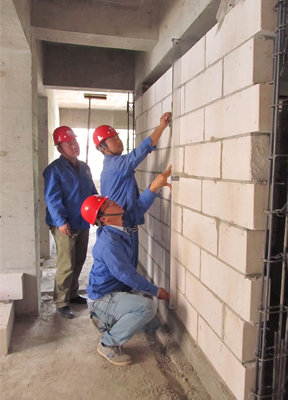 機械化公司昆鐵家園的管理人員正在進(jìn)行內(nèi)墻砌筑質(zhì)量檢測