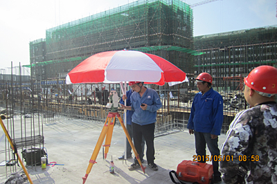 青島即墨藍(lán)色新區(qū)項(xiàng)目的同事正在烈日下測量樓層主控項(xiàng)線