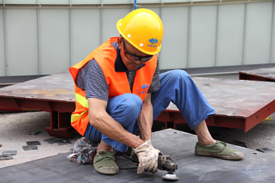內(nèi)江邱家嘴立交橋項(xiàng)目的工作人員正在給鋼板打磨