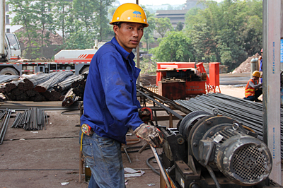 內(nèi)江邱家嘴立交橋項(xiàng)目的工作人員正在鋼筋操作間做切割處理