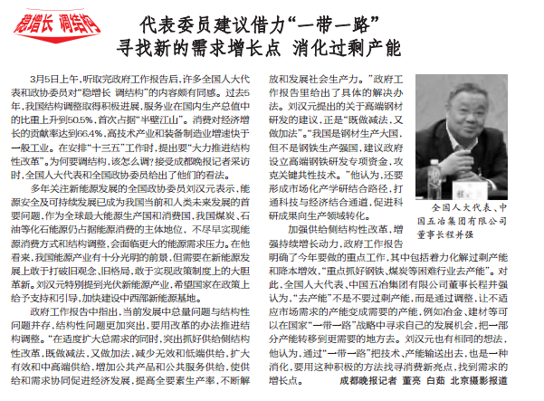 在3月7日《成都晚報》三版,“奮進‘十三五’加快建設(shè)國際化大都市——2016年全國兩會特別報道”中,記者以“委員代表建議借力‘一帶一路’ 尋找新的需求增長點 消化過剩產(chǎn)能”為題,就“十三五”大力推進結(jié)構(gòu)性改革話題對程并強進行了專訪。程并強在專訪中指出:加強供給側(cè)結(jié)構(gòu)性改革,增強持續(xù)增長動力,政府工作報告明確了今年要做的重點工作,其中包括著力化解過剩產(chǎn)能和降本增效,重點抓好鋼鐵、煤炭等困難行業(yè)去產(chǎn)能?!叭ギa(chǎn)能”不是不要過剩產(chǎn)能,而是通過調(diào)整,讓不適應(yīng)市場需求的產(chǎn)能變成需要的產(chǎn)能,例如冶金、建材等可以在國家“一帶一路”倡議中尋求自己的發(fā)展機會,把一部分產(chǎn)能轉(zhuǎn)移到更需要的地方去。