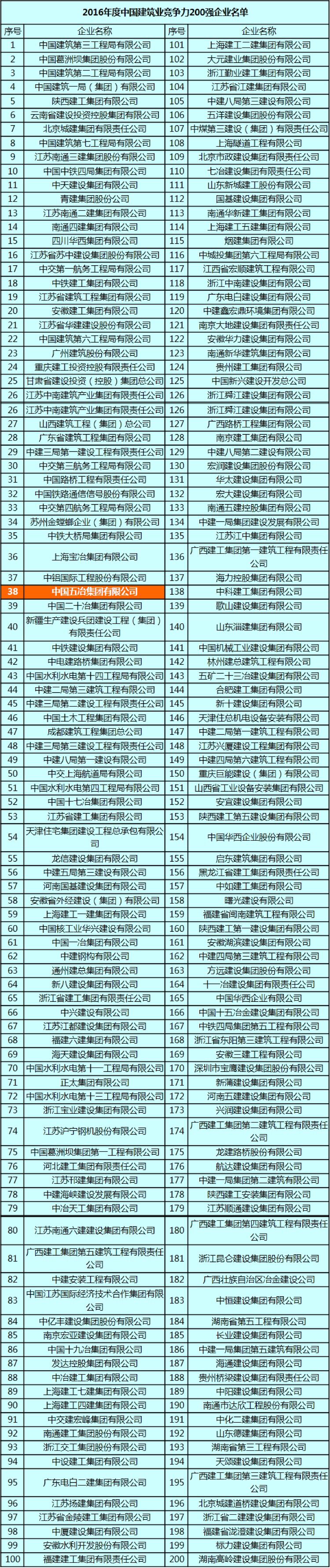 8月23日,中國建筑業(yè)協(xié)會公布了2016年度中國建筑雙200強企業(yè)評價結果。中國五冶集團再次入圍中國建筑業(yè)雙200強企業(yè)名單,位列競爭力200強企業(yè)名單第38位,比上年前進11位。