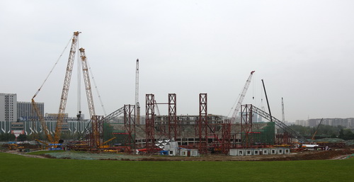 在主舞臺的施工現(xiàn)場,兩臺大吊車吊起一根鋼筋龍骨,在空中緩慢移動,而在地面的基座上,幾名焊工正在緊張焊接粗壯的支撐架?!斑@是我們吊裝的第二根主拱構(gòu)件,第一根已經(jīng)在昨天成功吊裝并脫鉤?!背啥悸短煲魳饭珗@項目經(jīng)理呂興建告訴記者團(tuán),近段時間,主拱的吊裝都將是最重要的任務(wù)。