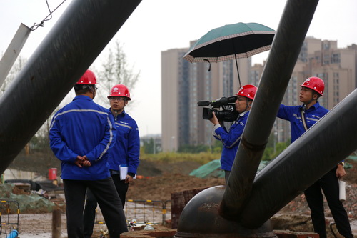 10月1日上午,成都市下起小雨。集團(tuán)公司文化中心記者團(tuán)一行走進(jìn)成都露天音樂公園項目的建設(shè)現(xiàn)場。記者團(tuán)在現(xiàn)場看到,盡管小雨一直淅淅瀝瀝,工地現(xiàn)場也比較泥濘,但各個作業(yè)面均在正常施工,到處都是一副熱火朝天的景象。
