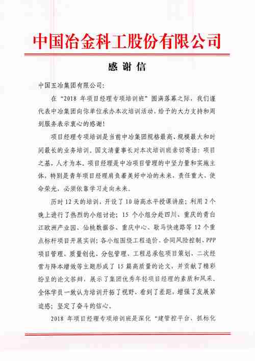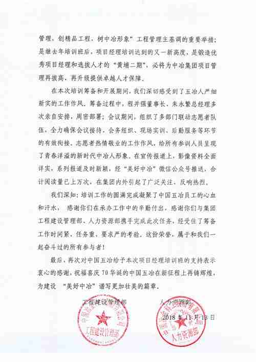 11月13日,中國冶金科工股份有限公司工程建設管理部、人力資源部向中國五冶發(fā)來感謝信,對公司在承辦中冶集團2018年項目經(jīng)理專項培訓活動過程中展現(xiàn)的嚴細新實的工作作風表示肯定。