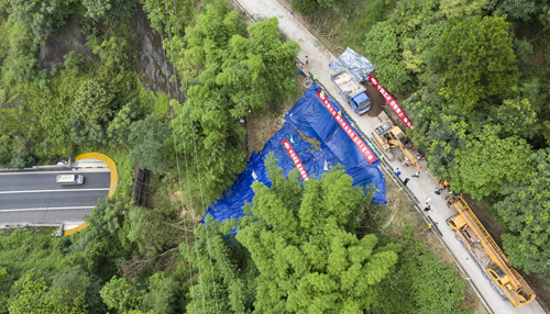 接到重慶市江北區(qū)規(guī)劃和自然資源局任務(wù)委托后,成勘公司立即集合精兵強將,連夜奔赴現(xiàn)場搶險。第一時間到達(dá)指定位置后,搶險項目團隊立即在滑塌區(qū)周邊采取斷道措施,設(shè)置警戒標(biāo)志,確保行人安全,并對滑塌體表層的石塊及樹木進行細(xì)致清理,疏通滑坡體后側(cè)公路長約60米的水溝,同時在現(xiàn)有公路外側(cè)修筑5厘米高的混凝土擋塊,防止地表水從公路內(nèi)側(cè)溢出到滑體后側(cè),利用防水布將現(xiàn)有滑塌體及其臨近一定的區(qū)域進行遮蓋,防止雨水進入誘發(fā)二次滑塌。
