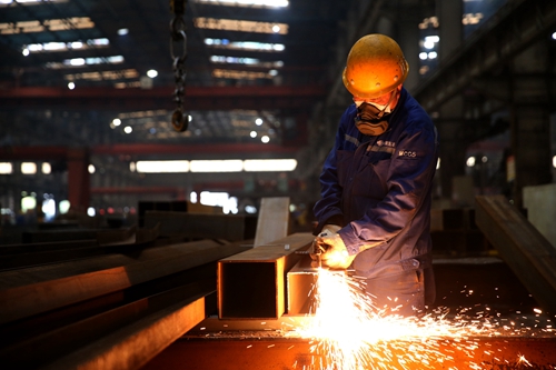 中國五冶鋼結構生產(chǎn)基地內 技術人員在焊花飛舞中加工部件